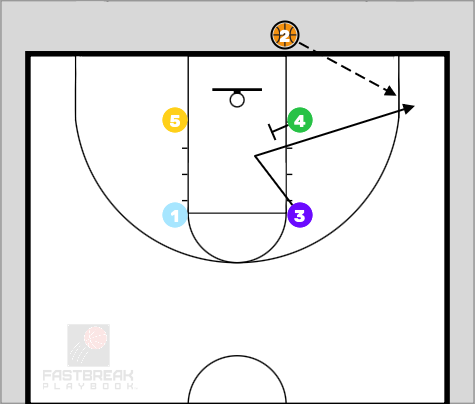 3 cuts towards the inbounder then turns to sprint to the weak-side corner of 4’s screen and continues to corner